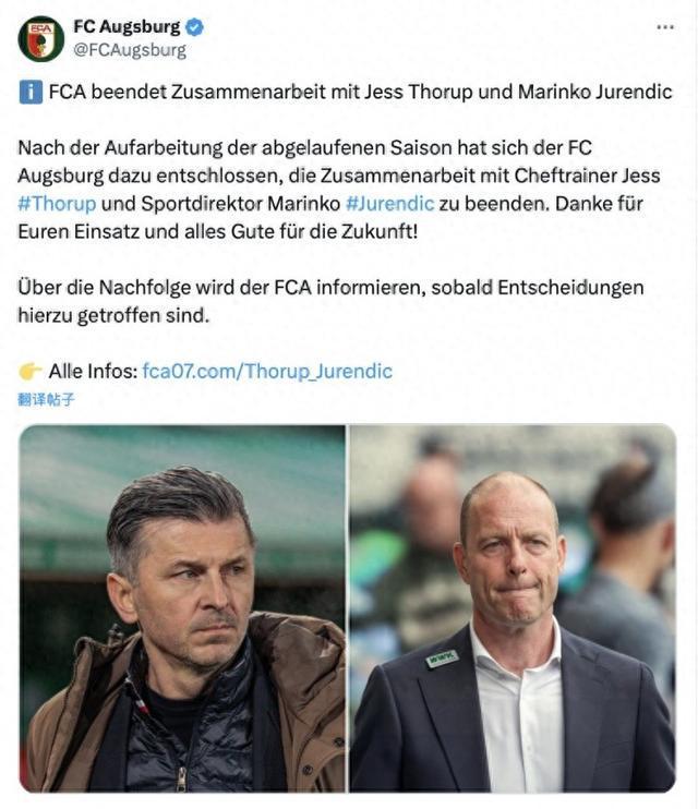 官方:奥格斯堡解雇主帅措鲁普以及体育总监尤伦迪奇